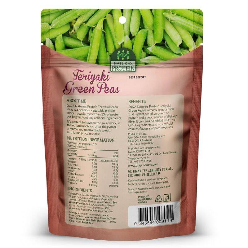 DJ&A Nature's Protein Teriyaki Green Peas is a delicious vegetable protein snack. It packs more than 13g of protein per bag without any artificial ingredients. It's perfect to have on the go, at work, in the school lunchbox, after the gym or anytime you need a ready to eat, nutritious protein snack!