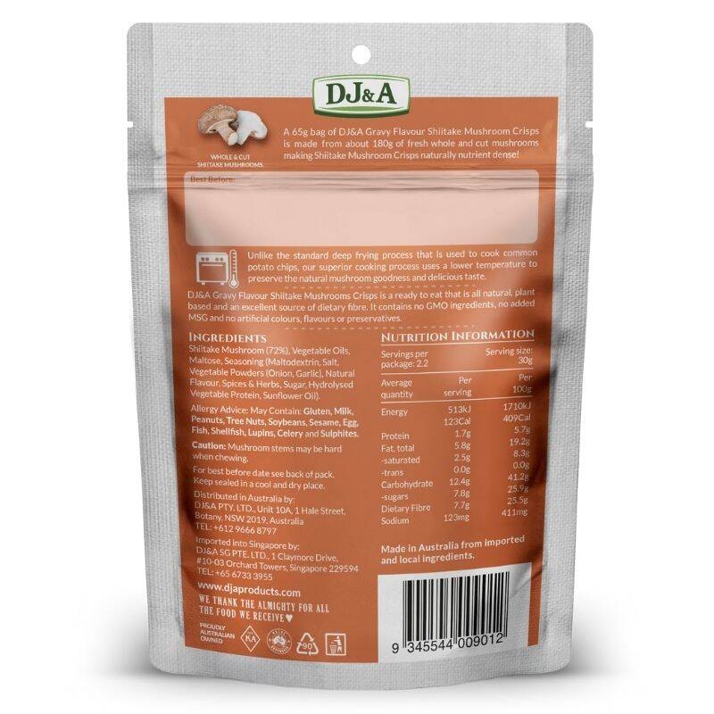 DJ&A Gravy Flavour Shiitake Mushroom Crisps is a ready to eat snack that is all natural, plant based and an excellent source of dietary fibre. It contains no GMO ingredients, no added MSG and no artificial colours, flavours or preservatives.